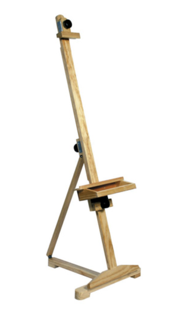 Caballete de fuerte estructura de madera con base transversal, permite ajustarlo a la inclinación deseada por medio de perillas, apropiados para artistas y estudiantes en el trabajo de escuela y taller.