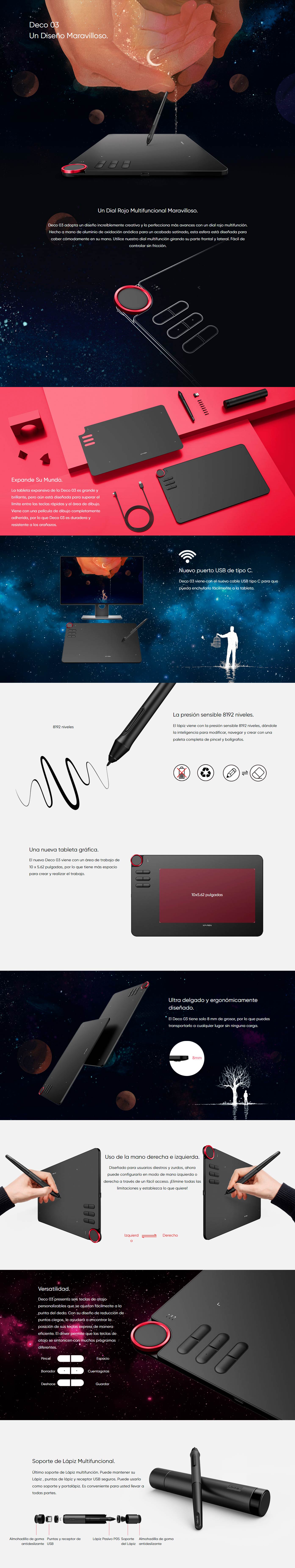 La XP-Pen Deco 03 es una tableta gráfica diseñada para artistas digitales y diseñadores. Ofrece un área de trabajo amplia y sensible a la presión para una precisión excepcional al dibujar y diseñar. Con características como teclas de acceso rápido personalizables y un lápiz ergonómico sin batería, proporciona una experiencia intuitiva y fluida. Ideal para aquellos que buscan una herramienta profesional para expresar su creatividad en medios digitales