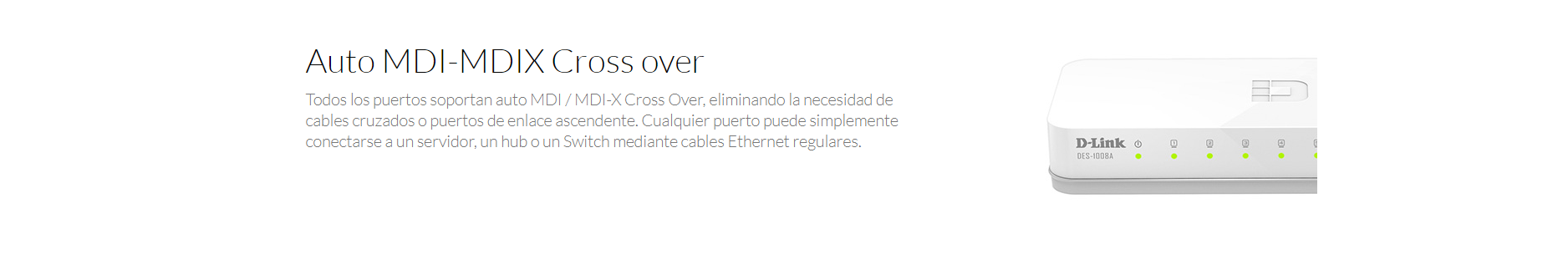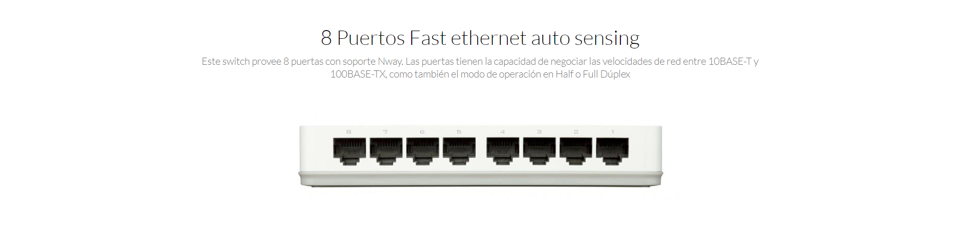 Switch No Administrable de 8 puertos Fast Ethernet 10/100BASE-TX. No requiere de configuración y su instalación es fácil y rápida. Soporta MDI/MDI-X en todos sus puertos. Este switch provee 8 puertas con soporte Nway. Las puertas tienen la capacidad de negociar las velocidades de red entre 10BASE-T y 100BASE-TX, como también el modo de operación en Half o Full Dúplex